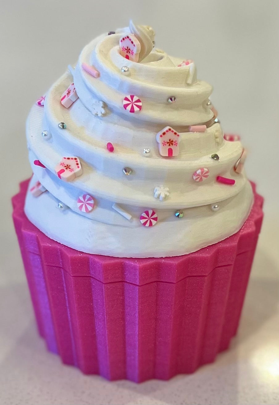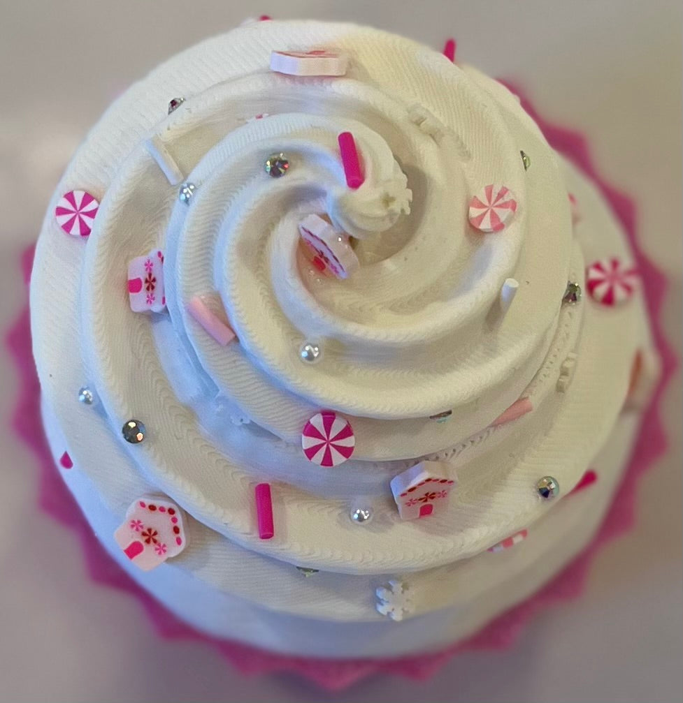 This 3.5"x5" masterpiece is a symphony of visual sweetness, featuring a 3-D printed cupcake with luscious vanilla frosting. Adorned with pink gingerbread house sprinkles, glistening glass AB crystals, miniature pink and white candies, faux pearls and a cascade of pink and white sprinkles and snowflakes, this cupcake is a festive treat for the senses.