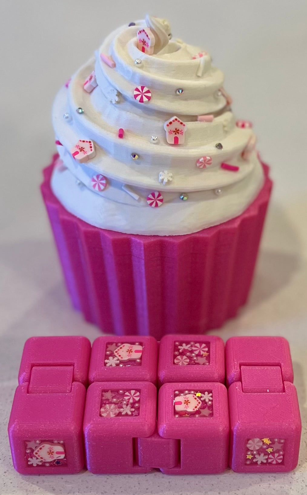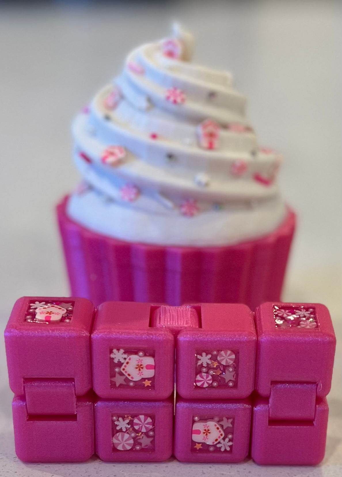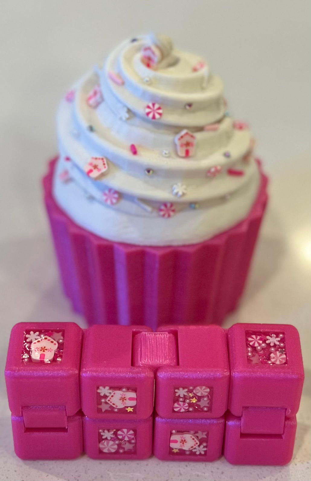 Encased in an iridescent pink cupcake wrapper, the magic doesn't stop there. Discover an inner world of wonder with an infinity cube boasting handcrafted resin art and matching pink gingerbread house sprinkles, miniature candies, faux pearls, snowflakes, and even glow-in-the-dark stars. Illuminate your cupcake experience with the included miniature black light, perfectly designed to fit inside the cupcake and bring the stars to life whenever the mood strikes.