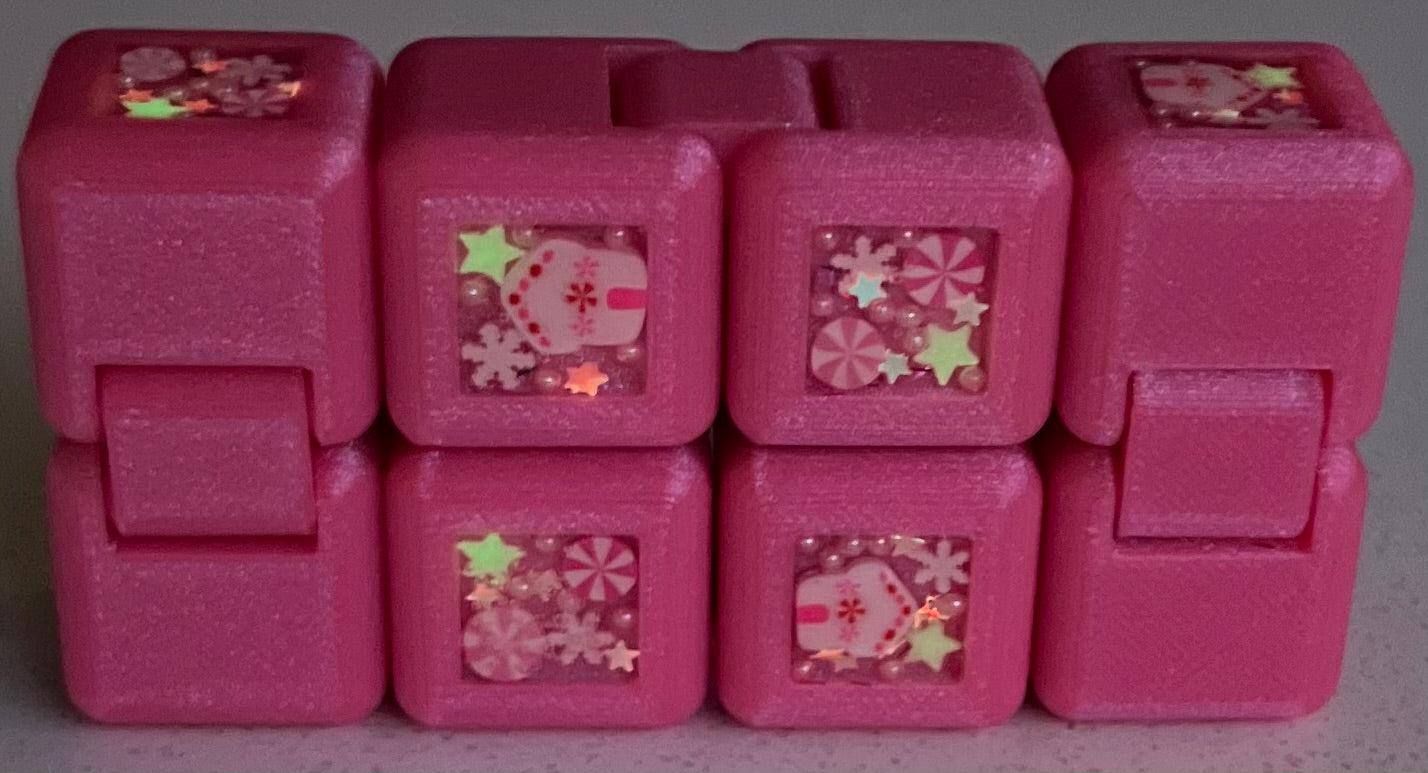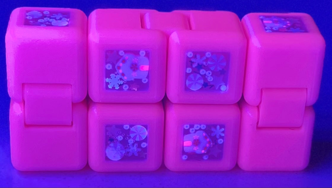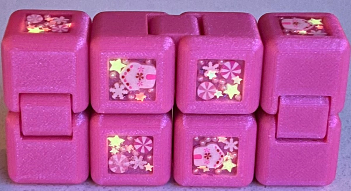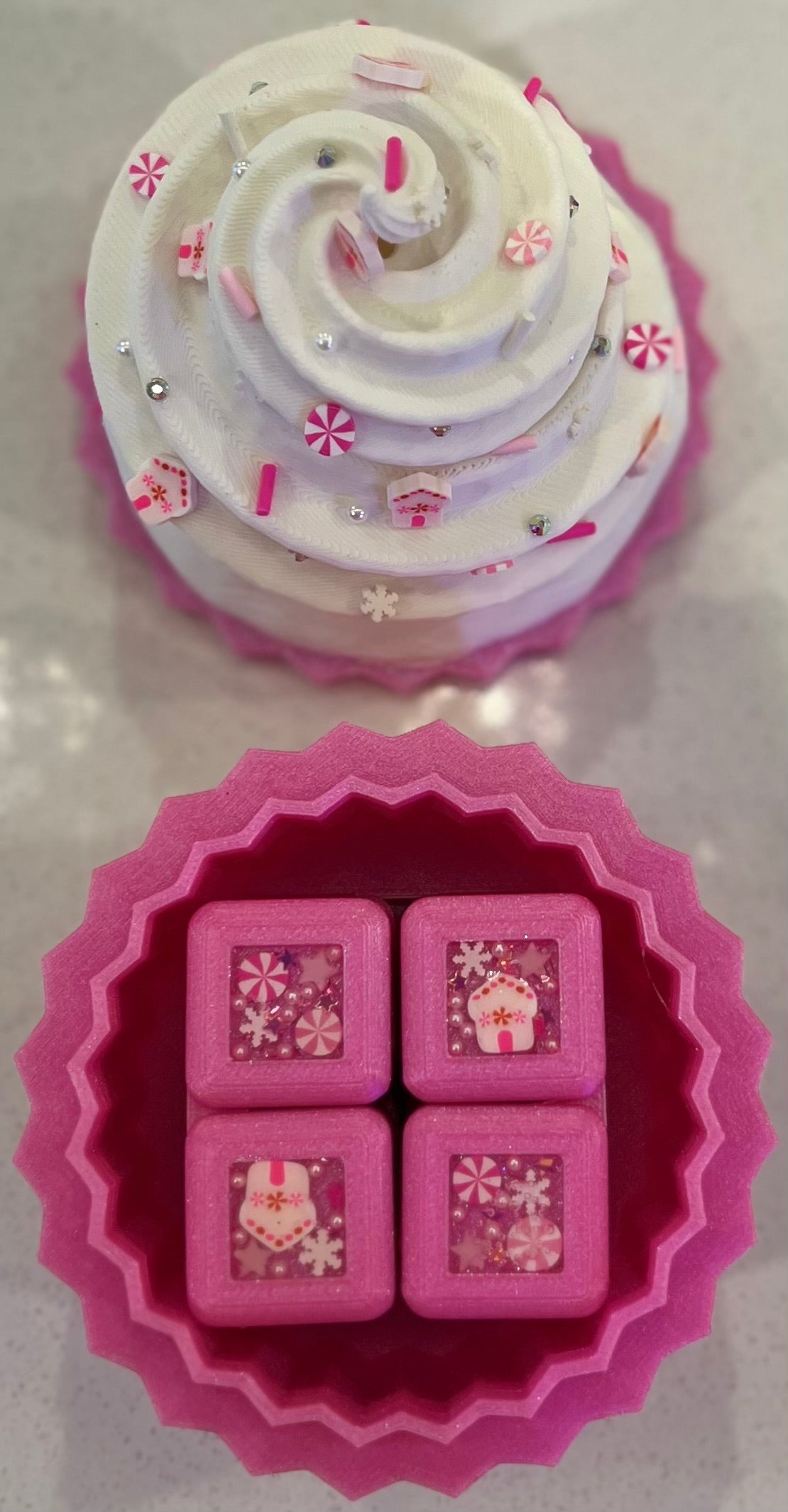 Encased in an iridescent pink cupcake wrapper, the magic doesn't stop there. Discover an inner world of wonder with an infinity cube boasting handcrafted resin art and matching pink gingerbread house sprinkles, miniature candies, faux pearls, snowflakes, and even glow-in-the-dark stars. Illuminate your cupcake experience with the included miniature black light, perfectly designed to fit inside the cupcake and bring the stars to life whenever the mood strikes.