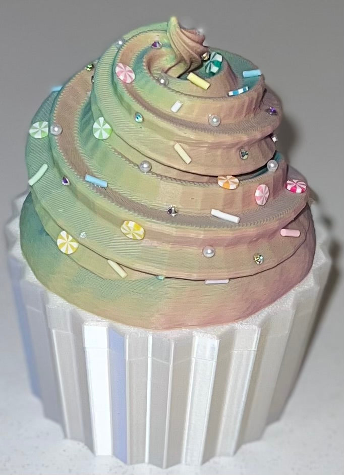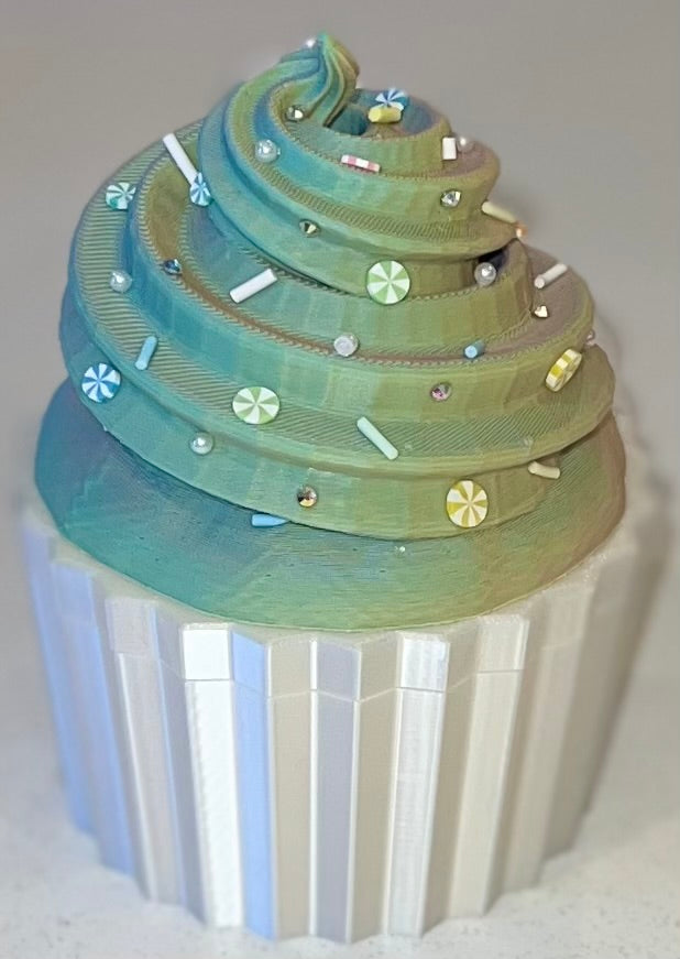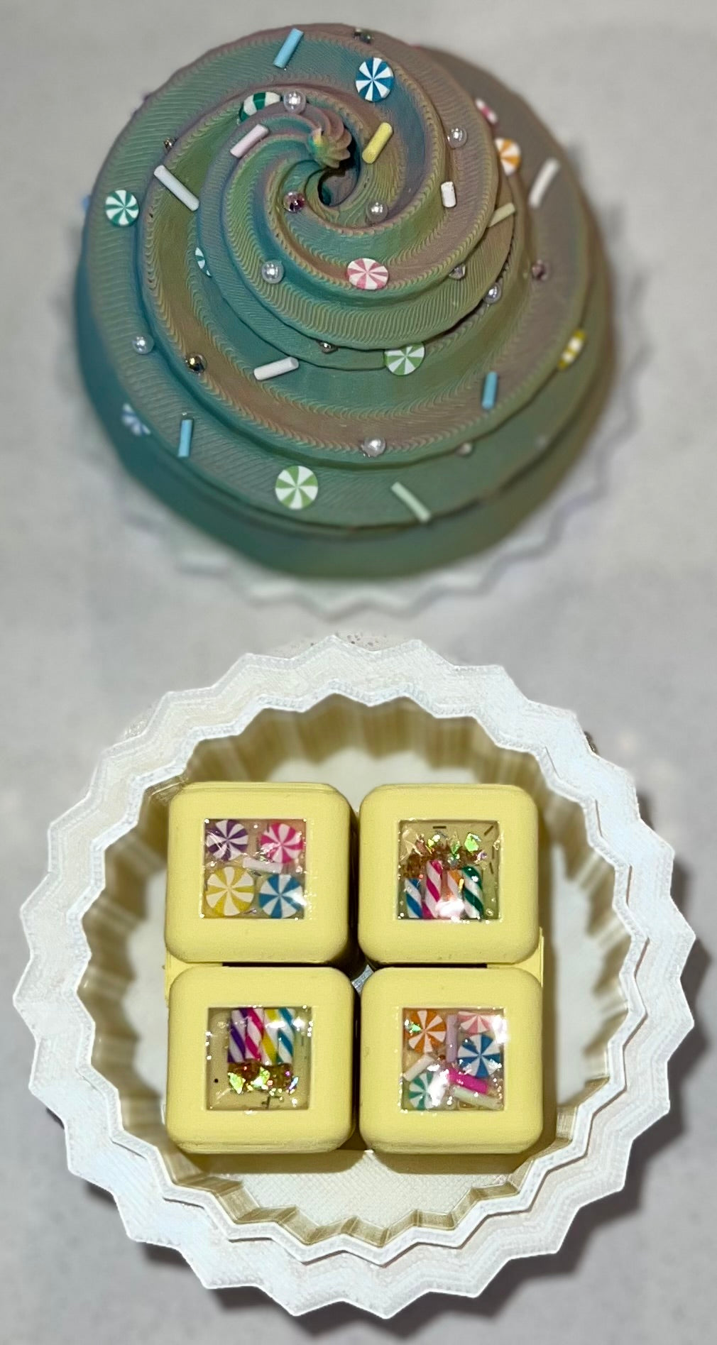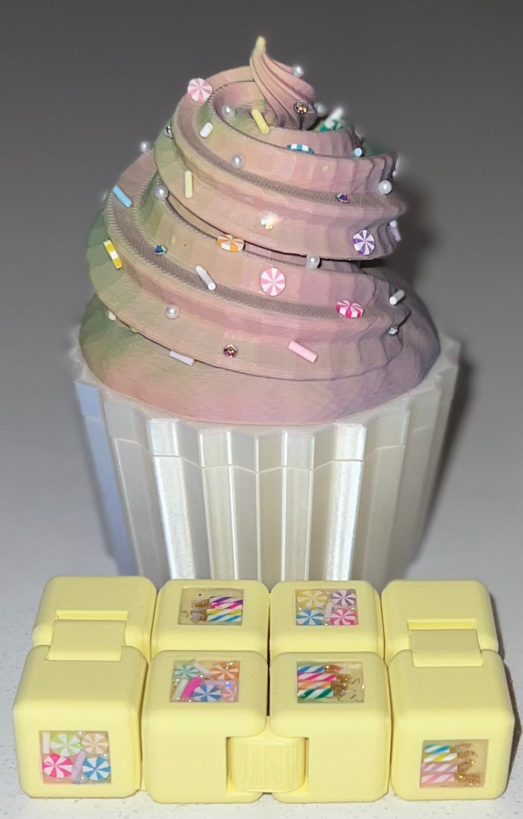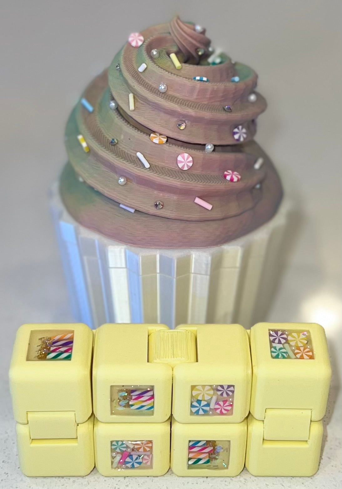 Introducing the ChromaTwirl Birthday Cupcake – a 3D printed confectionary masterpiece that combines whimsy artistry and a touch of magic! Nestled within the heart of this delightful treat is a surprise: an enchanting yellow “cake” infinity cube. Adorned with birthday candles, sprinkles and delectable candy pieces, the cube features mesmerizing resin artwork that captures the essence of celebration.