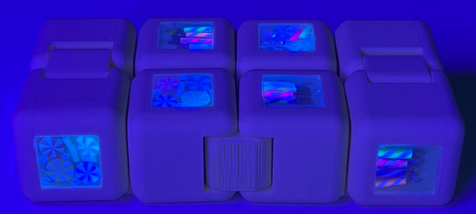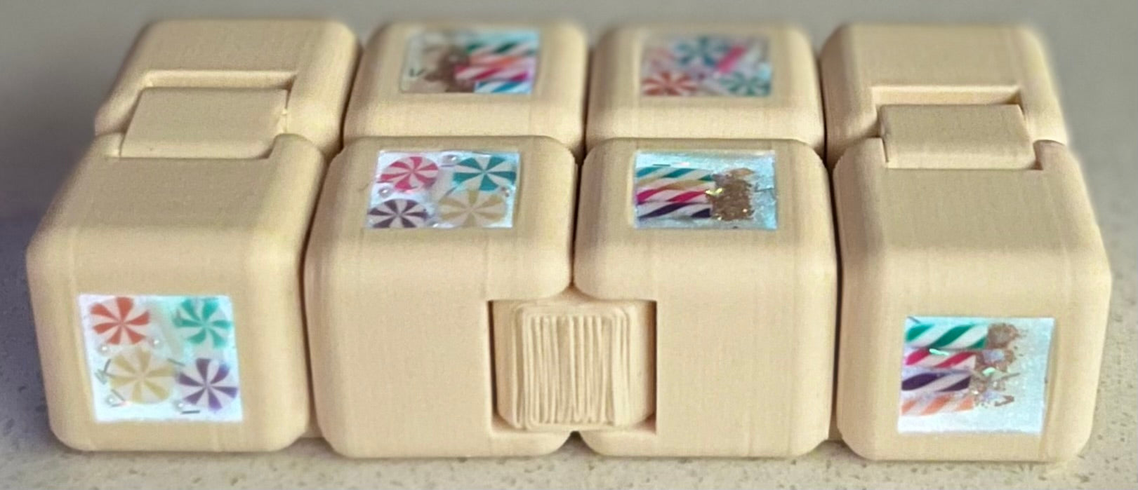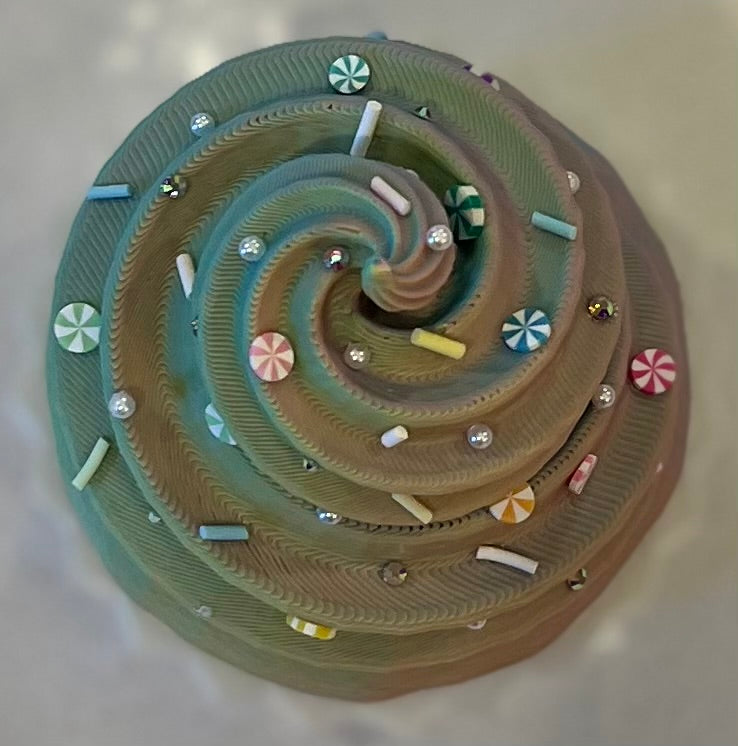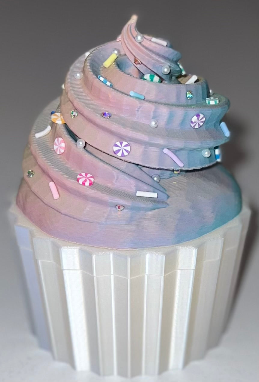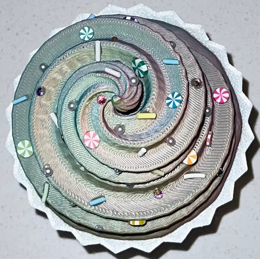 Introducing the ChromaTwirl Birthday Cupcake – a 3D printed confectionary masterpiece that combines whimsy artistry and a touch of magic! Nestled within the heart of this delightful treat is a surprise: an enchanting yellow “cake” infinity cube. Adorned with birthday candles, sprinkles and delectable candy pieces, the cube features mesmerizing resin artwork that captures the essence of celebration.