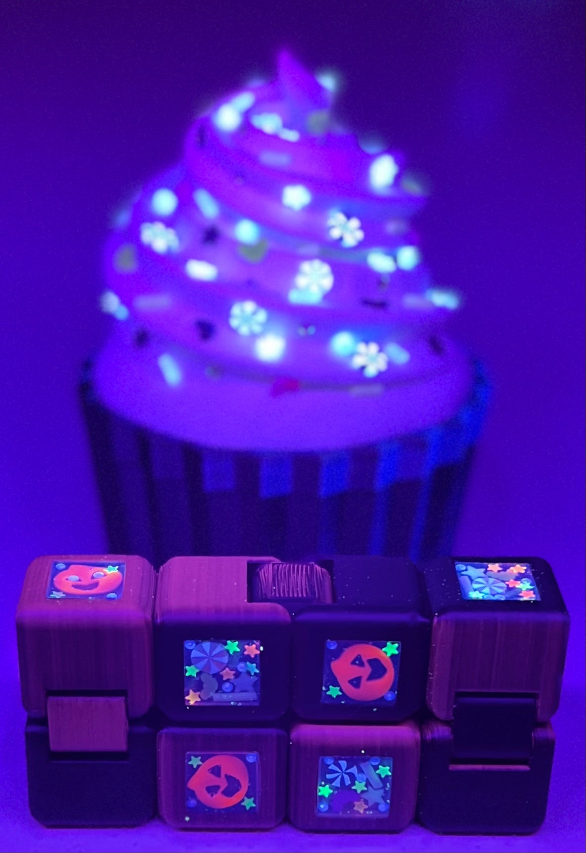 Take the enchantment a step further by revealing the matching infinity cube inside the cupcake. The cube showcases handcrafted resin art featuring spicy Jack-O-Lanterns, offering a glowing and UV-reactive display that perfectly complements the cupcake's theme. As an additional twist, give the cupcake a spin to watch the wrapper transform from mysterious black to ghostly white.