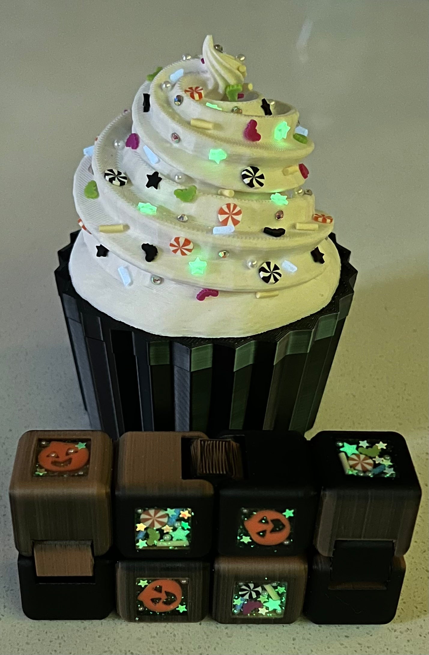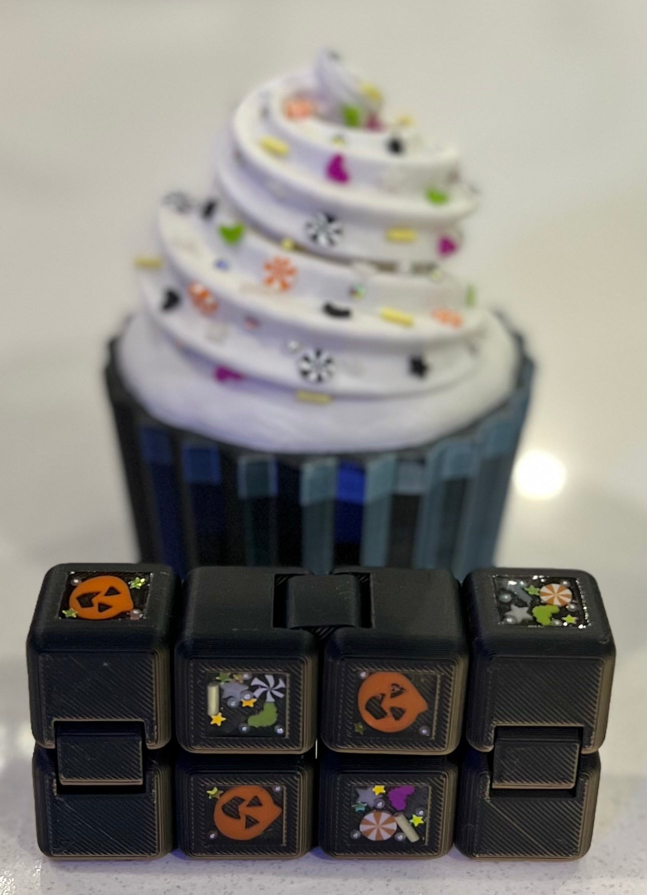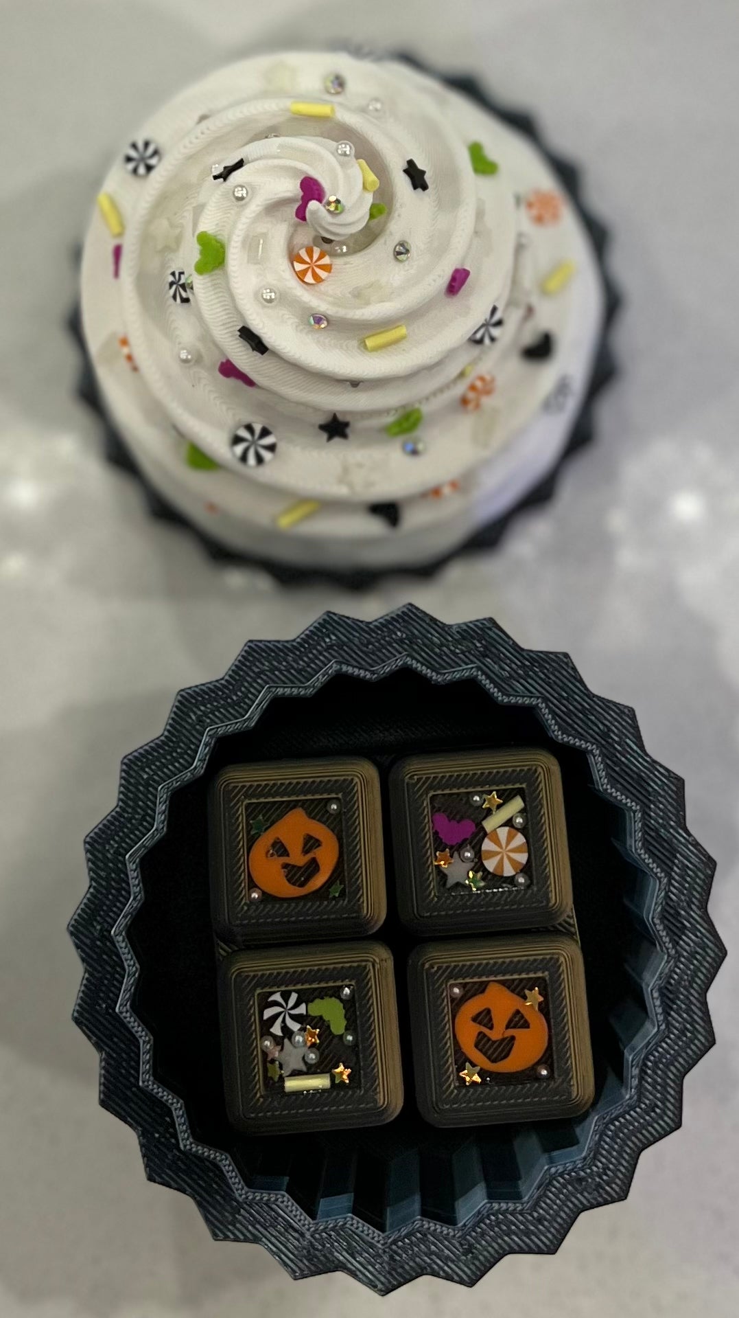 Share in the thrilling spirit of Halloween with our Spicy Pumpkin Cake Batter Cupcake and Infinity Cube Set. This 3D printed delight features a bewitching cupcake adorned with vanilla frosting that plays host to winged creatures of the night, glass AB crystals, glow-in-the-dark stars and sprinkles. The cupcake is a visual and aromatic delight of pumpkin spice, emanating the essence of Halloween.