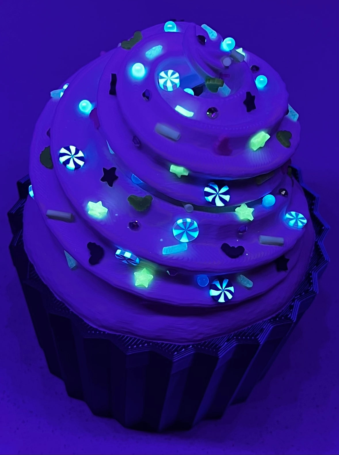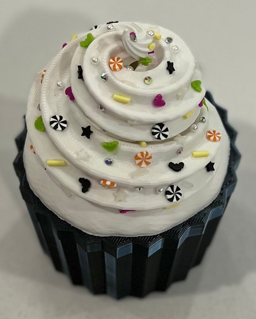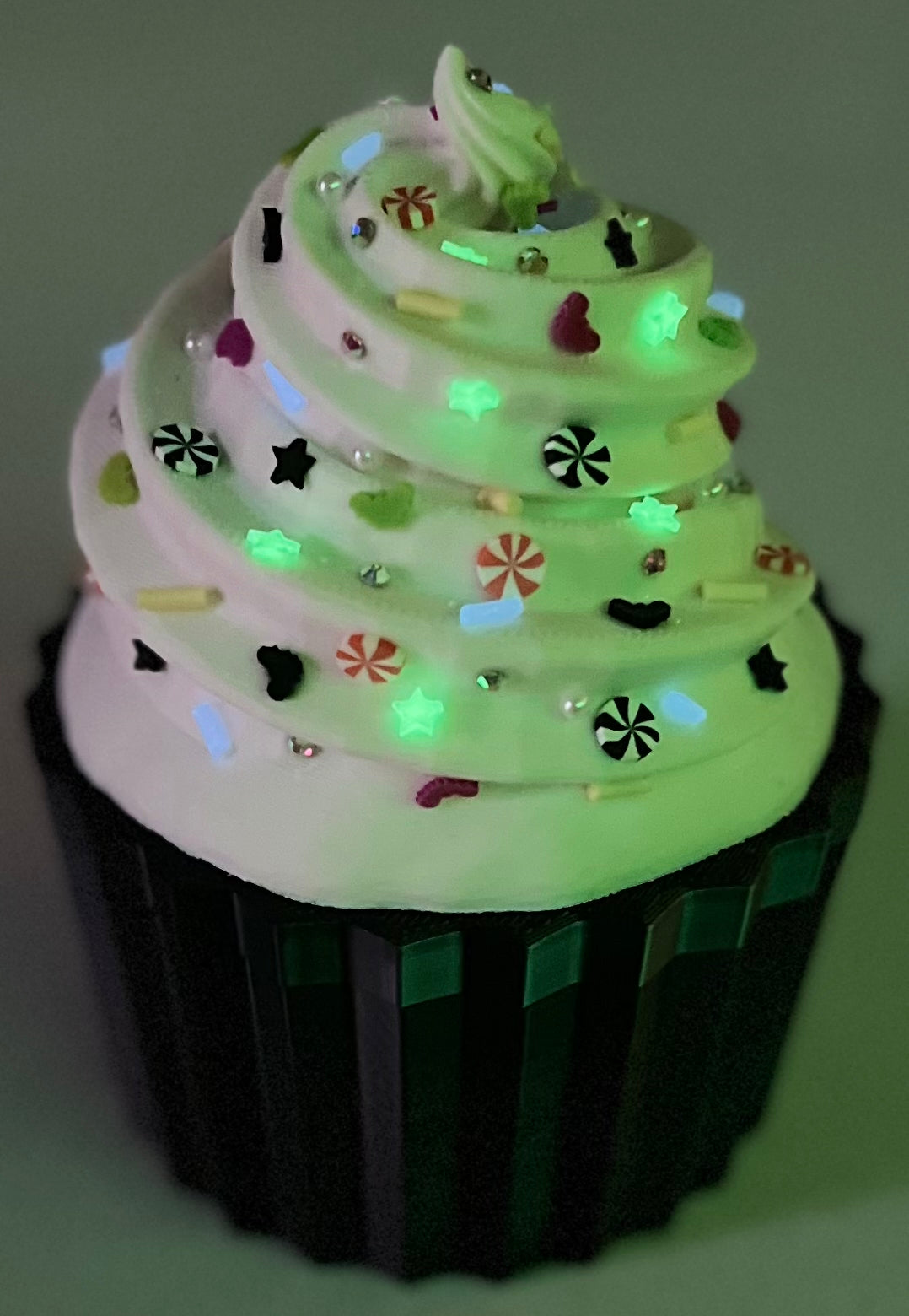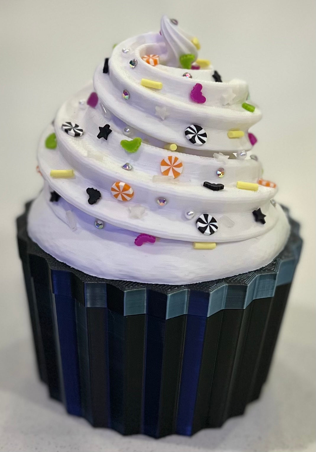 Share in the thrilling spirit of Halloween with our Spicy Pumpkin Cake Batter Cupcake and Infinity Cube Set. This 3D printed delight features a bewitching cupcake adorned with vanilla frosting that plays host to winged creatures of the night, glass AB crystals, glow-in-the-dark stars and sprinkles. The cupcake is a visual and aromatic delight of pumpkin spice, emanating the essence of Halloween.